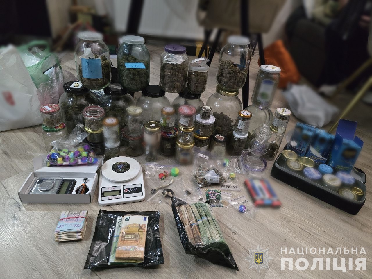 Під час обшуків правоохоронці вилучили 800 грамів кокаїну, 2 кг канабісу, 5 мільйонів гривень в різній валюті, пакувальні матеріали та "чорнові" записи.