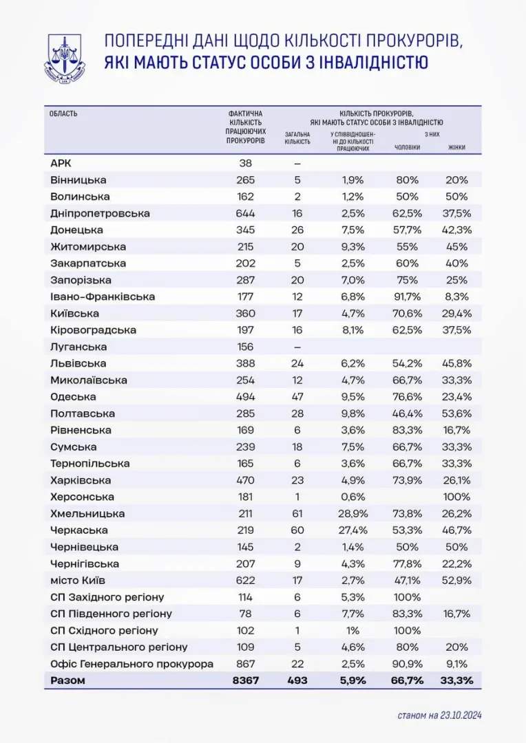 У решті прокуратур та ОГП цей показник не перевищує 10%. Зокрема, у 18 прокуратурах частка прокурорів, які мають групи інвалідності, менша за 5% від загальної чисельності, ще в 11 прокуратурах — від 5% до 10%.