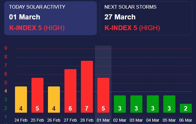 У суботу, 1 березня, очікується сонячна активність з К-індексом 5 (червоний рівень), що відповідає сильним магнітним бурям.