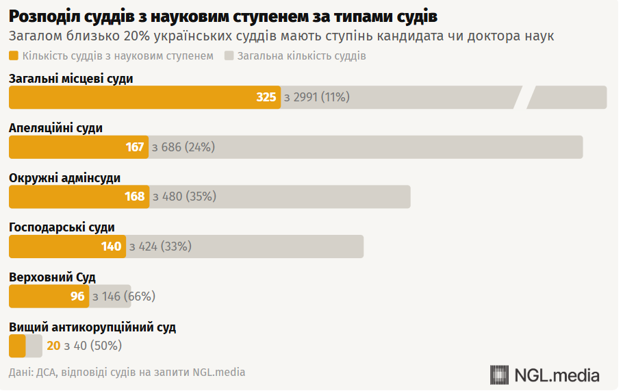 Загалом в Україні налічується 916 суддів із науковим ступенем (це близько 20% від загальної кількості).