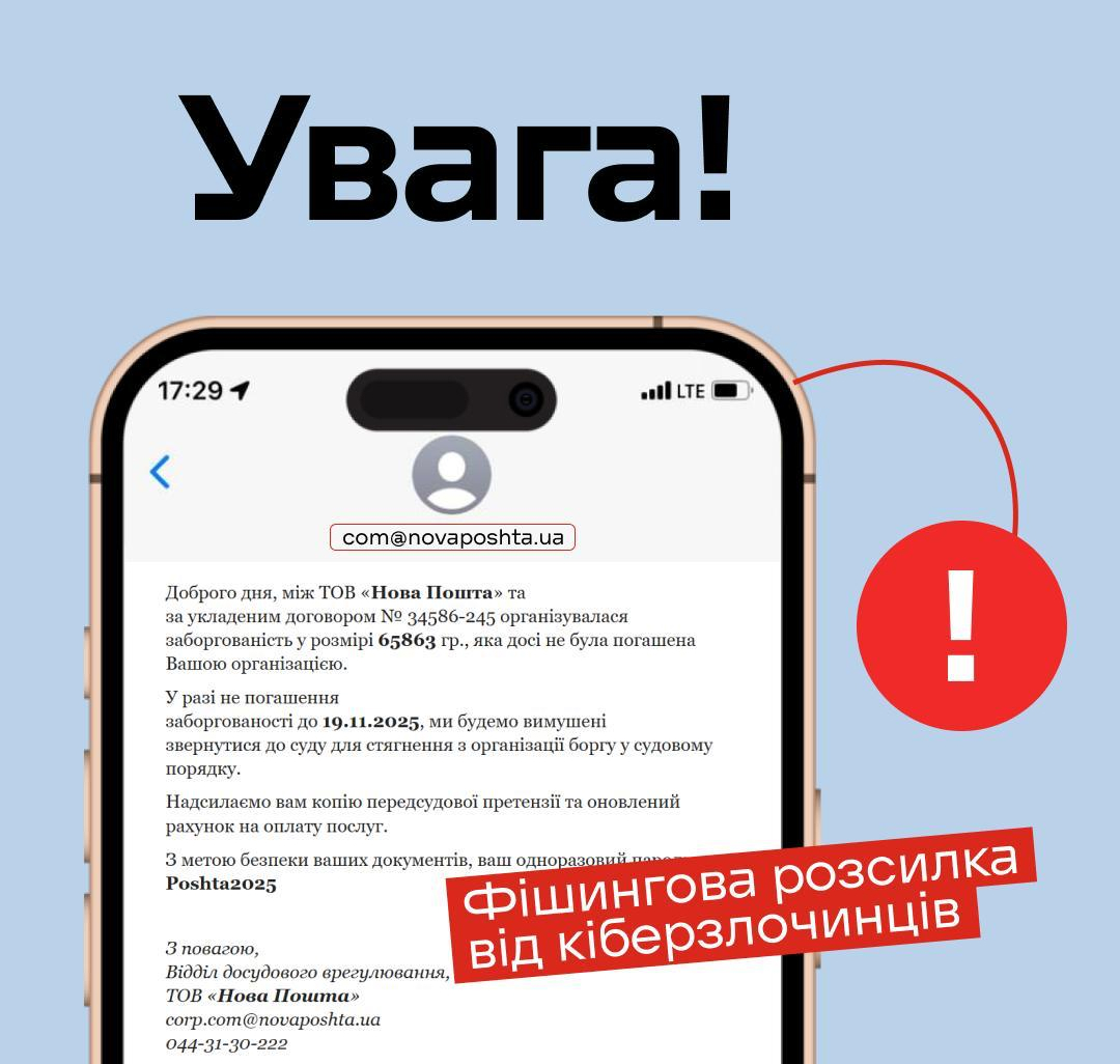 Кіберзлочинці почали розсилку фейкових електронних листів нібито про «заборгованість» перед «Новою поштою». Ці повідомлення не мають жодного відношення до компанії: шахраї копіюють логотип, підміняють адресу відправника та вигадують борги, щоб змусити вас відкрити вкладення або перейти за шкідливим посиланням. Про це повідомили в офіційному Telegram-каналі «Нової пошти»