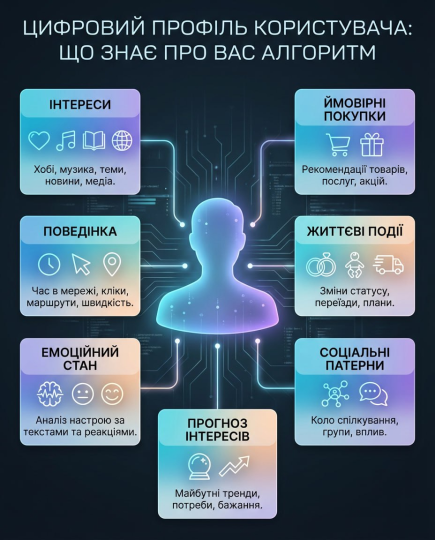 Уявіть, що десь на сервері існує неформальний «портрет» – цифровий профіль, який описує, що вам подобається, на що ви реагуєте, які події можуть статися найближчим часом. Для алгоритму ви – не імʼя й прізвище, а набір показників і ймовірностей.