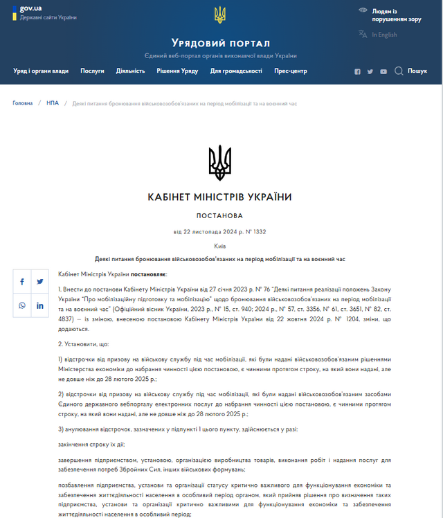 Усі відстрочки від мобілізації втрачають чинність 28 лютого 202. Про це йдеться у постанові Кабміну № 1332 від 22 листопада, пише Радіо Трек.
